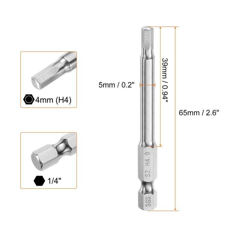 - Size - Hex wrench drill bit size: 4mm (H4), hex shank size: 1/4", total length: 65mm / 2.6", rod dia.: 5mm / 0.2", effective rod length: 39mm / 0.94", hardness: HRC58-60. Each hex screwdriver bit is clearly engraved with size number for easy identification.