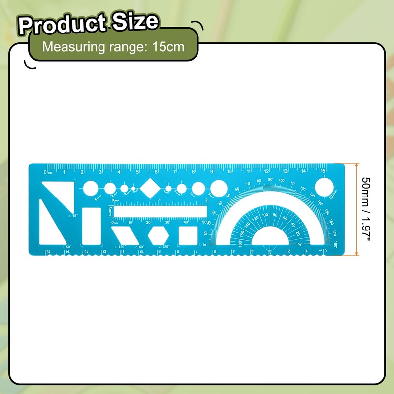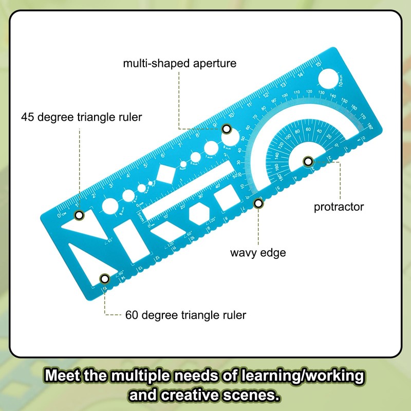 This innovative tool integrates a straight ruler, protractor, and triangle ruler into one compact design. It features precision-cut templates for circles, triangles, diamonds, rectangle, and hexagons in various sizes, enabling effortless drafting of diverse geometric shapes. Portable and versatile, it enhances drawing efficiency for classroom, office, or workshop use.