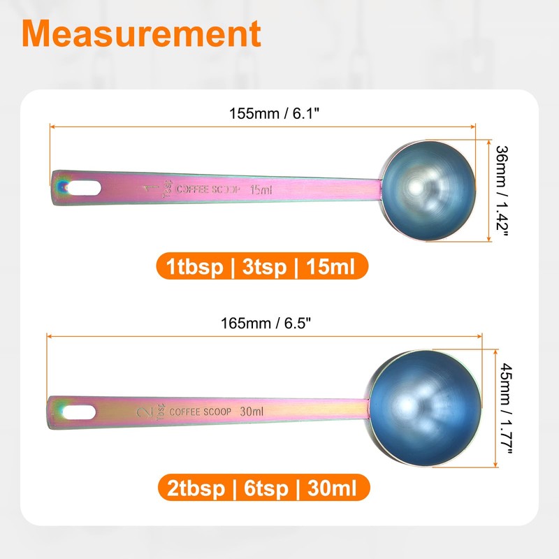 - Size - Teaspoon set is 1tbsp | 3tsp | 15ml, 2tbsp | 6tsp | 30ml, color is multicolor, the total size is 155 x 36mm / 6.1 x 1.42 inch (L*W), 165 x 45mm / 6.5 x 1.77 inch (L*W), and the handle size is 120 x 12mm / 4.72 x 0.47 inch (L*W), 120 x 13mm / 4.72 x 0.51 inch (L*W). The accurate measurement size is engraved on the handle of the teaspoon, which is easy to read, can effectively reduce measurement errors, and is durable.