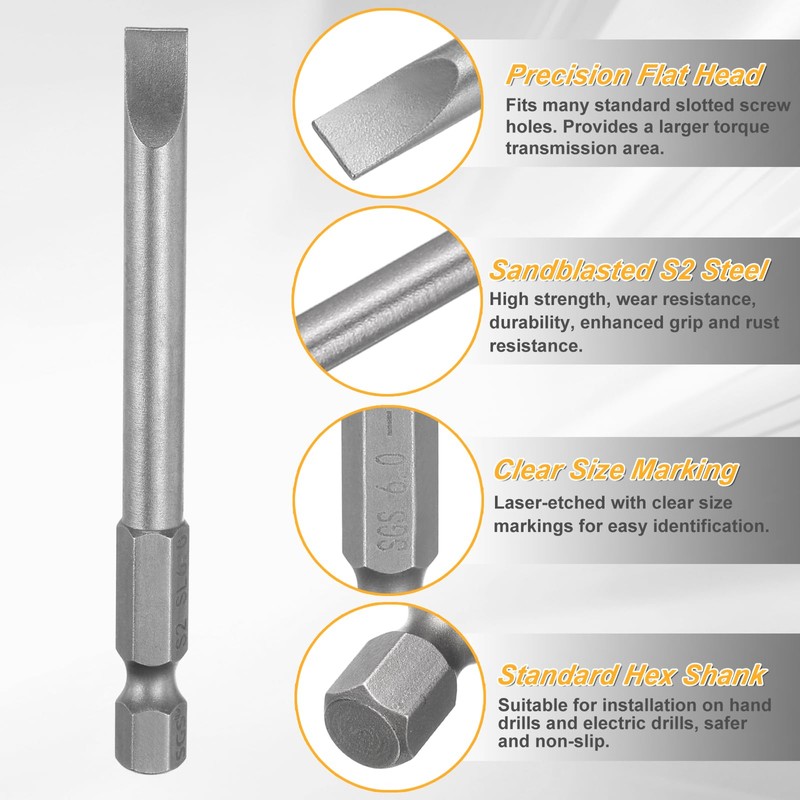 - Size - Magnetic Slotted Screwdriver Bit Size: SL6 (6mm), Total Length: 75mm /3", Hex Shank: 1/4", Rod Diameter: 6mm /0.24". Each screwdriver head is clearly engraved with the model for easy identification.