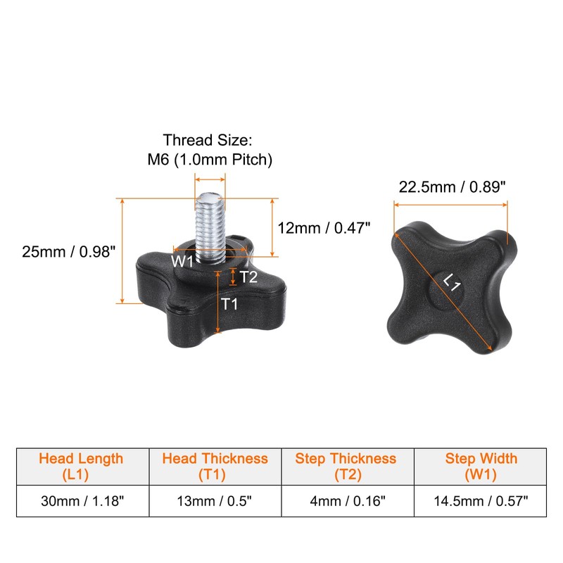 - Size - Thread size: M6 (1.0mm Pitch); threaded stud length: 12mm / 0.47"; head size: 30mm x 22.5mm x 13mm / 1.18" x 0.89" x 0.5"; step size: 14.5mm x 4mm / 0.57" x 0.16"; total length: 25mm / 0.98"; knob style: 4-star