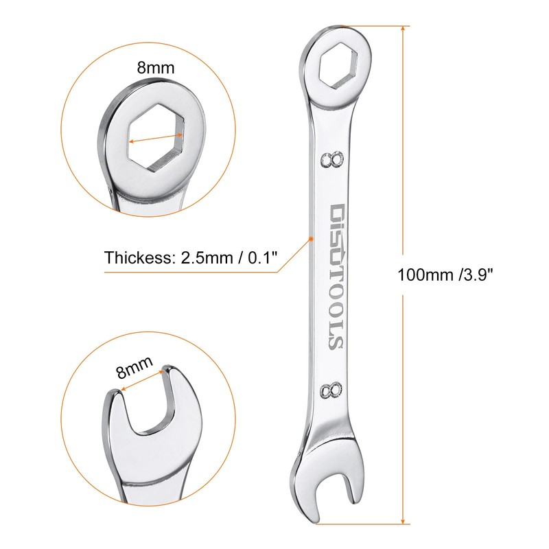 - Size - Size: 8mm; Type:6Point; Offset: 15 Degree; Total Length: 100mm /3.9 inch; Packing List: 2Pcs x Combination Wrench