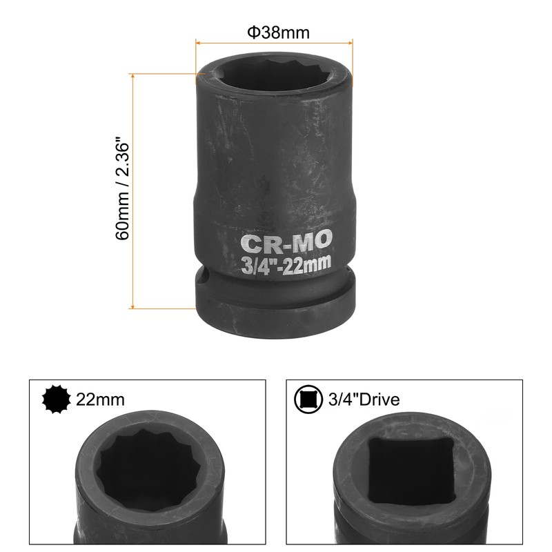 • 【Size】Drive: 3/4-inch, 12-Point Socket Size: 22mm, Total Length: 60mm / 2.36-inch. The size label is laser marked on the socket, making locating and retrieving the socket you need effortless.