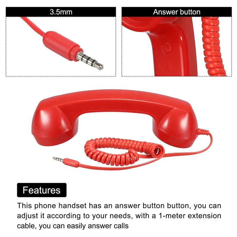 - The Telephone Handset provides here, Color: Smooth Red; Round Socket Diameter: 3.5mm; Cable length: 1M/3.28FT; Handset Size:21*6.2*6.7cm/8.27*2.44*2.64“(L*W*H)
