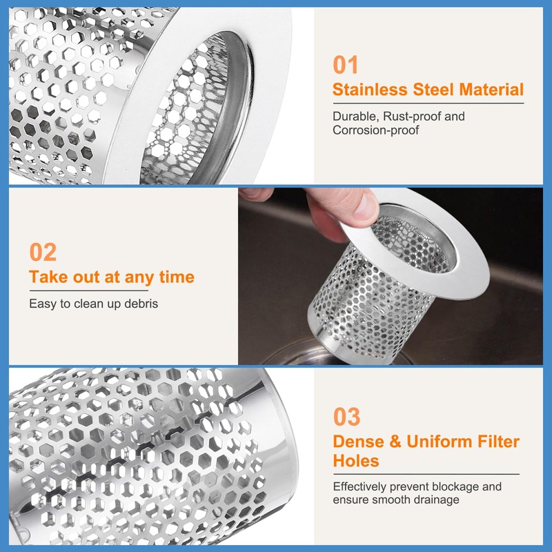 • [What You Get] - Package content comes with 3 packs of 304 stainless steel deep sink drain strainer, with 50 x 50mm/1.97 x 1.97inch(H*OD) in overall size. Fit hole size: 30-50mm/1.18-1.97inch. Fit installation height: more than 50mm/1.97inch. Note: Please choose the correct size according to the measurement guide to avoid buying the wrong size.
