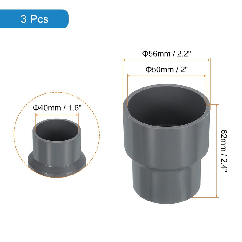 - [PVC Reducer Coupling Adapter] The small hole inner diameter of the PVC reducer coupling adapter is 40mm/1.6", the large hole inner diameter is 50mm/2", and the total size is 56x62mm/2.2"x2.4"(W*H), you will receive 3 pcs of PVC reducer coupling adapters. Please confirm the correct outer diameter of the water supply pipe before ordering
