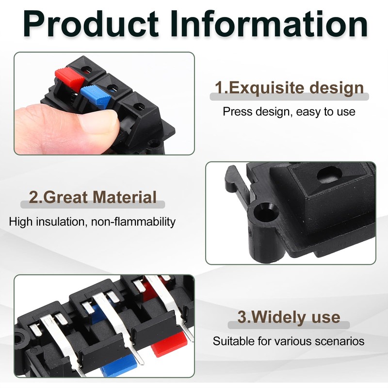 - Speaker spring connectors are often used in high-end audio, custom speakers or speaker upgrades, printed circuit boards, speakers, electronic engineering technology, compound door test clips, LED lamp test terminals, aging wire test clips, etc., suitable for speaker terminal connector test clips for various electronic devices. It is widely used in home and industrial applications for testing, aging and quick connection.