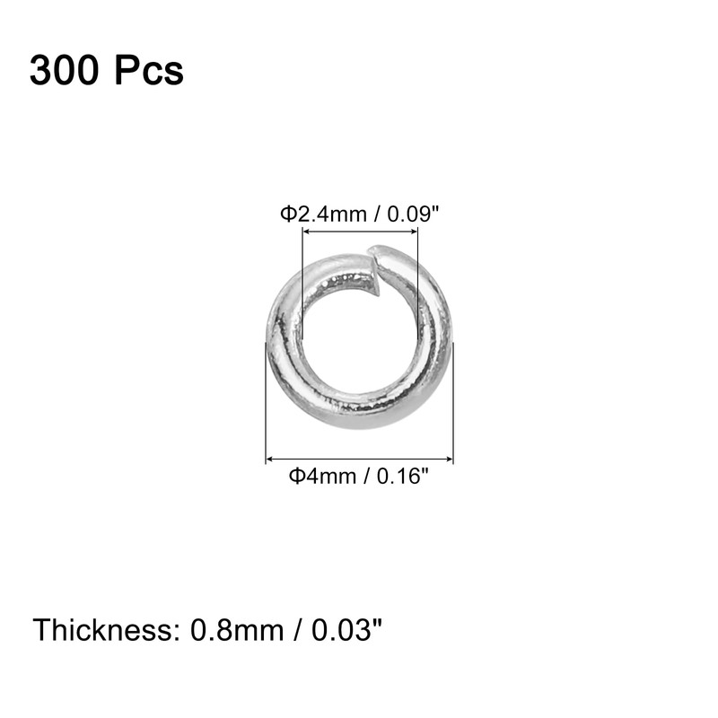 - Color: Silver; Material: 316 Stainless Steel; Thickness: 0.8mm / 0.03"; Inner Diameter: 2.4mm / 0.09"; Diameter: 4mm / 0.16"; Package Content: 300pcs x Open Jump Rings