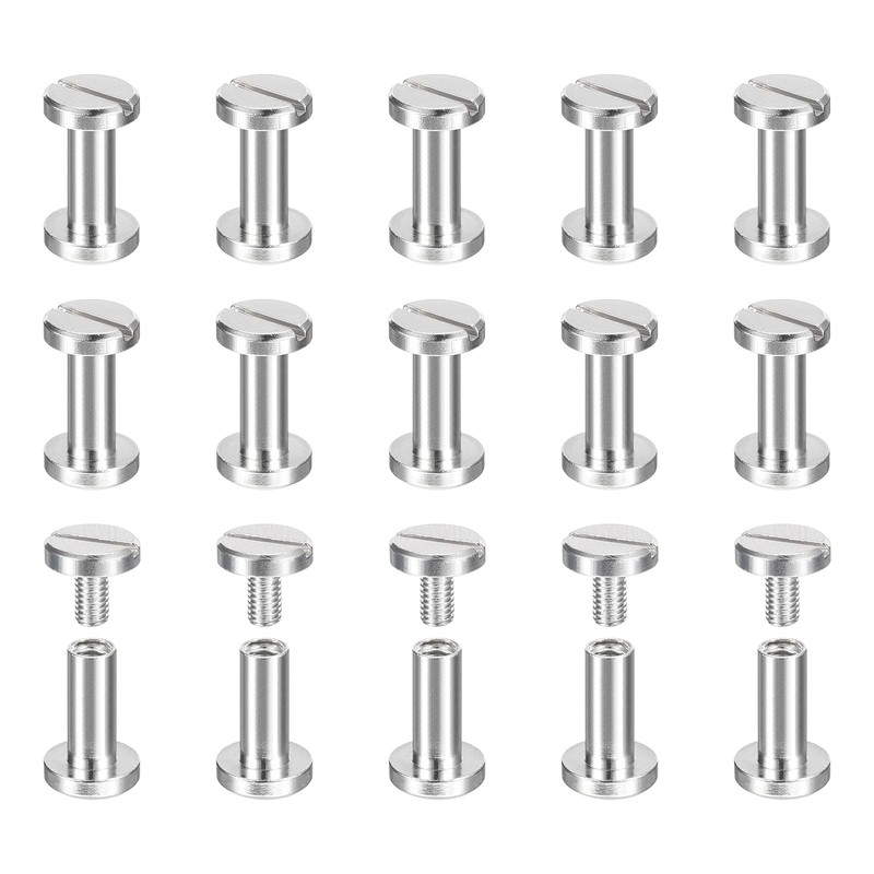 - [Chicago Screw Rivets] - Screw Type: Slotted; Shape: Flat Round Head; Base Diameter: 8mm/ 0.31-inch; Screw Size: M4 (4mm/ 0.16-inch); Post Rod Length: 3mm/ 0.12-inch; Total Height: 7mm/ 0.28-inch; Package: 30 Sets Chicago Screw Rivets
