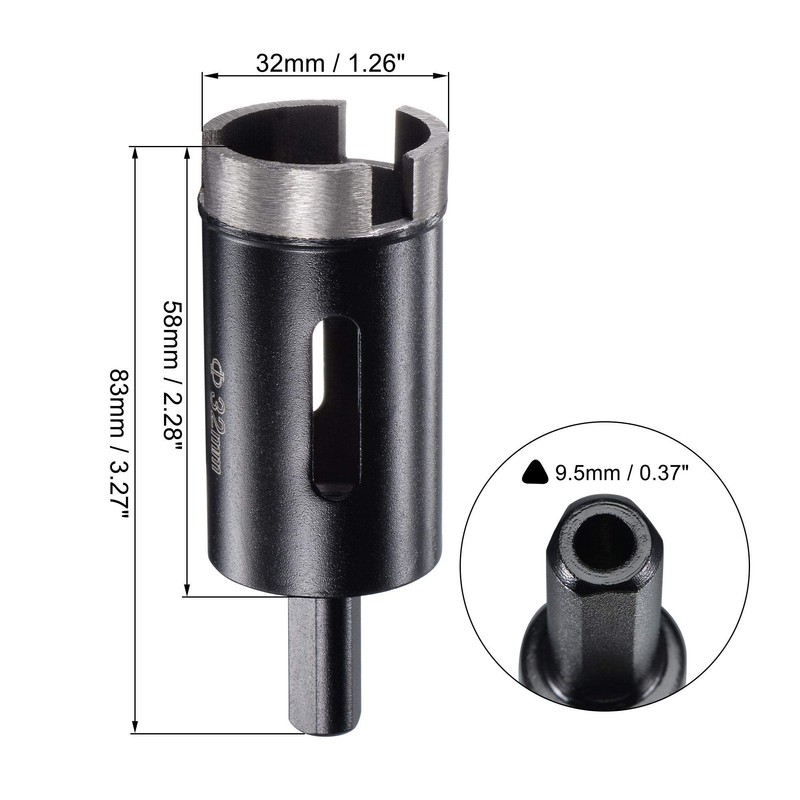 • Drilling diameter: 32mm / 1.26"; drilling depth: 58mm / 2.28"; shank size: 9.5mm / 0.37". Non-slip triangle shank fits most electric hand drills and bench drills.