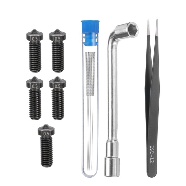 sourcing map 3D Nozzles Kit, 5pcs 3D Printer Stainless Steel Nozzles 0.5mm, 5pcs Nozzle Cleaning Needles, with a Socket Wrench and a Tweezer, for 1.75mm Ender3 Series