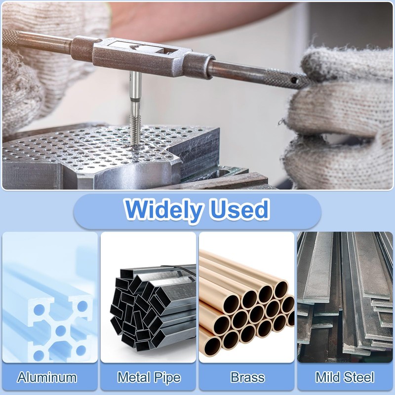 • Widely Used: Hand tap set is used to re-thread damaged or jammed threads, or to create new threads. Suitable for tapping through or shallow holes in mild steels, aluminum, iron, copper, hard plastic. Provides fast downward chip removal for efficient threading.