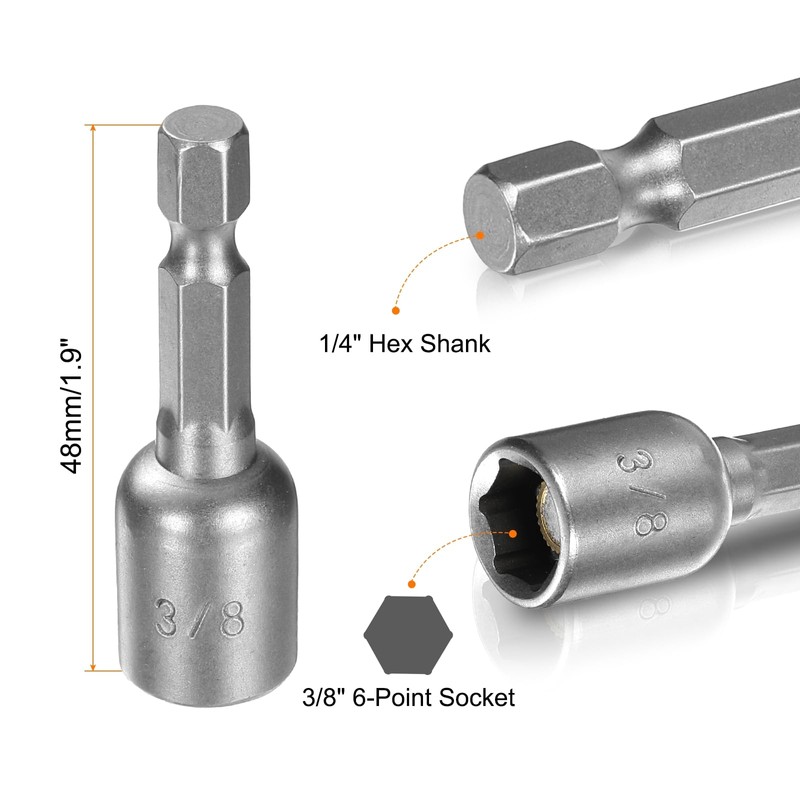 - Size - The SAE 6-point socket size is 3/8", the hex shank is 1/4", and the overall length is 1.9" (48mm).