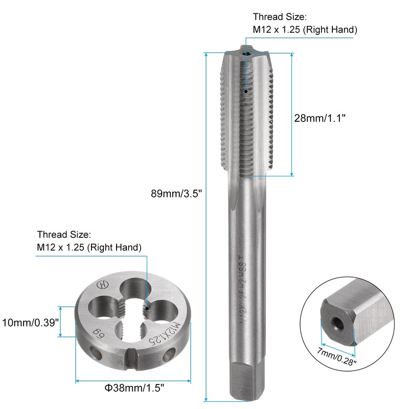 - Metric Tap and Die Set: Thread size: M12 x 1.25 (right hand); tap total length: 89mm / 3.5"; tap thread length: 28mm / 1.1"; tap square shank width: 7mm / 0.28"; tap accuracy: H2; die outside diameter: 38mm / 1.5"; die thickness: 10mm / 0.39"
