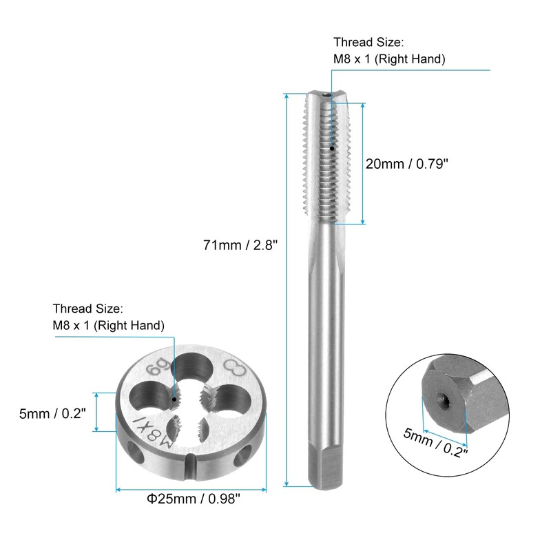 - Metric Tap and Die Set: Thread size: M8 x 1 (right hand); tap total length: 71mm / 2.8"; tap thread length: 20mm / 0.79"; tap square shank width: 5mm / 0.2"; tap accuracy: H2; die outside diameter: 25mm / 0.98"; die thickness: 5mm / 0.2"