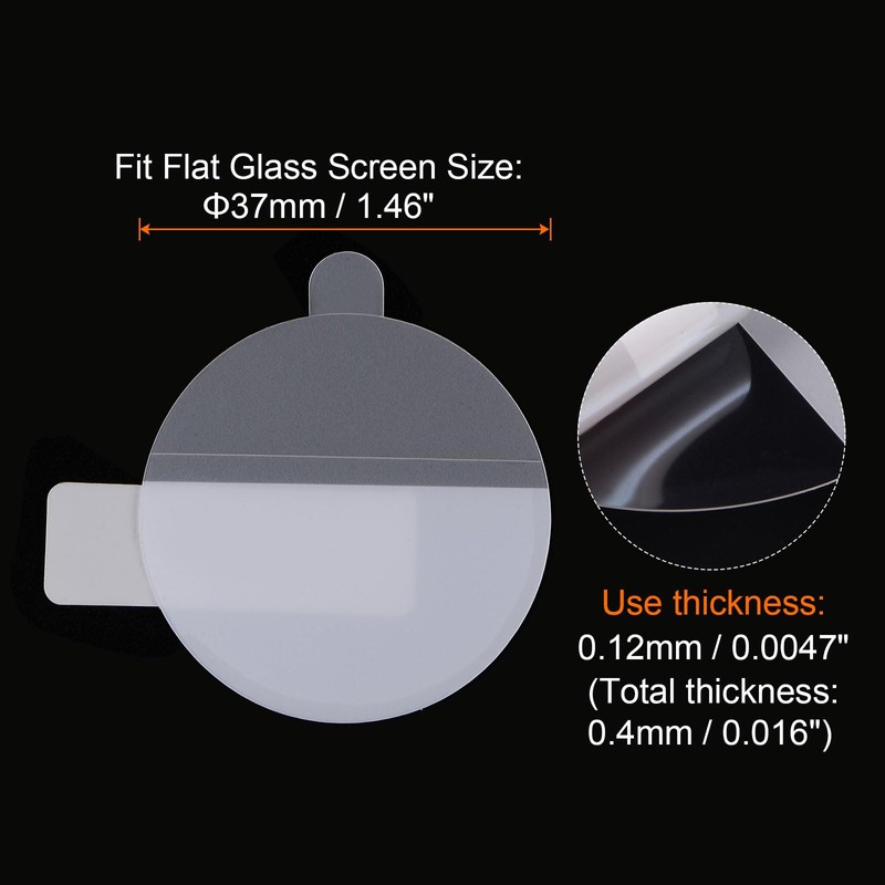 • Size - Fit glass screen size: 37mm / 1.46", Use thickness: 0.12mm / 0.0047", Total thickness: 0.4mm / 0.016", (suitable for flat screens, not for curved screens.); Compatible brand: universal; Shape: round. Packaging includes: 3pcs film, 1pcs dustproof cloth, 3pcs dust removal sticker, 1pcs scraping card, and 1pcs kraft paper bag.