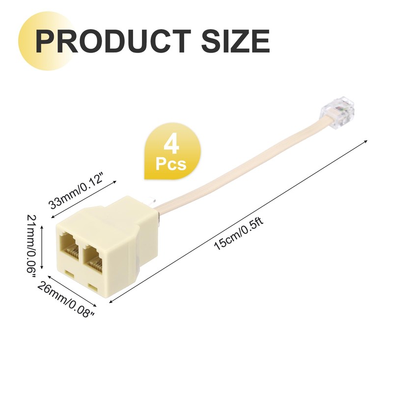 - Telephone Jack Splitter, Length: 15cm/0.5ft, Color: Yellow, Wire Size: 2.4 x 4.8mm/0.09 x 0.19 Inch, Head Size: 33 x 26 x 21mm/0.12 x 0.08 x 0.06 inch(L*W*H), Wire: Bare Copper 4-Core Telephone Flat Wire, Connector: RJ11 6P4C Crystal Head, In the Package: 4 x Phone Line 2 Way Splitter