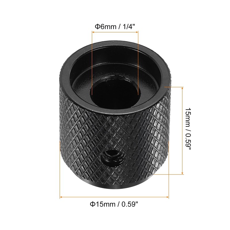 - Aluminium Alloy Potentiometer Knob: Size: 15 x 15 mm / 0.59 x 0.59 inch (OD x H); Material: Aluminium Alloy; Mounting Hole Dia: 6mm / 1/4 inch; Color: Black;