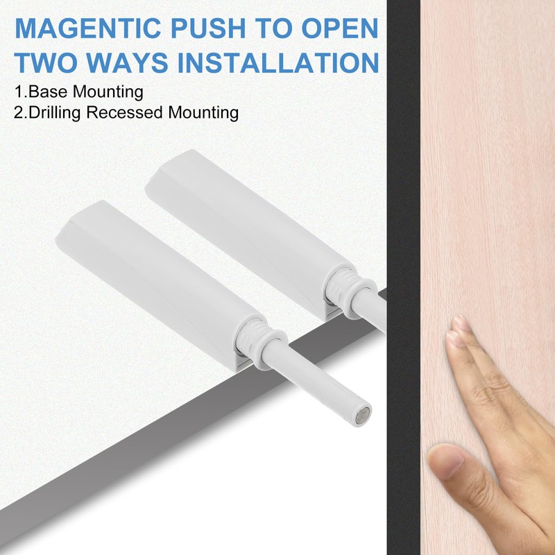 - Secure Closure: Our push to open system features a long-stroke design with a built-in magnet that ensures a secure close point, preventing "drifting open" doors. You can rotate the magnetic tip of the inner core left or right to adjust its extra extension length of 2-9 mm to fit the gap of the door.