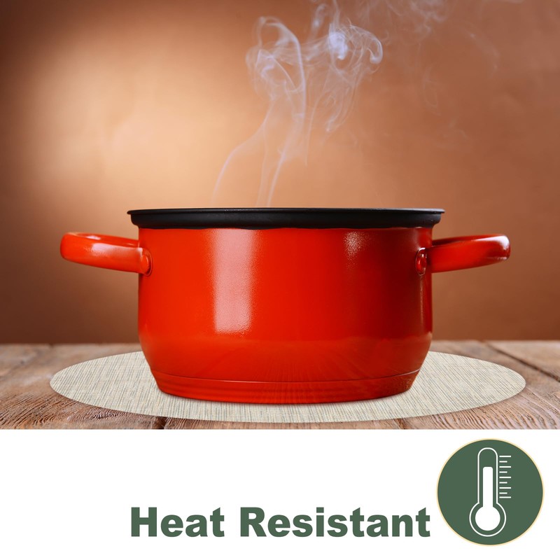 FEATURE - The textured backing of the round placemats has an excellent non-slip grip, ensuring that your cups or drinks remain stable on any tabletop. They have excellent thermal insulation properties, protecting your table from heat damage caused by hot food and hot drinks, and also protecting your table from spills.