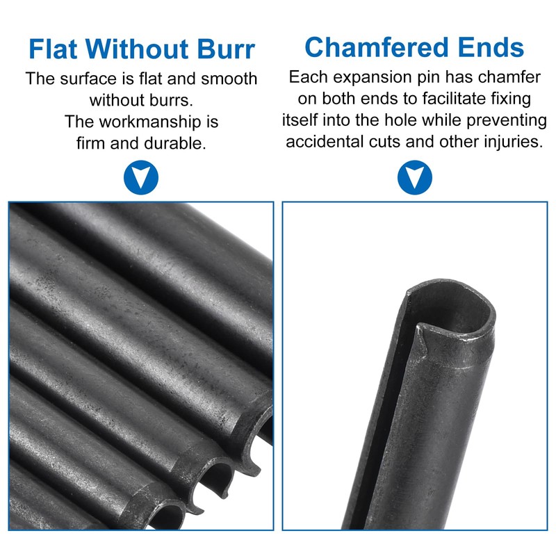 - Design: The slotted spring pins, featuring chamfers on both ends, ensure a secure fastening effect, minimize the risk of hole damage, easy installation, and it is designed for repeated use