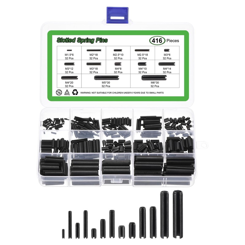 - Package Includes: Total 416pcs slotted spring pins in the size of: M1.5x6mm, M2x18mm, M2.5x10mm, M2.5x18mm, M3x6mm, M3x12mm, M3x18mm, M4x8mm, M4x10mm, M4x14mm, M4x20mm, M5x30mm, M6x30mm