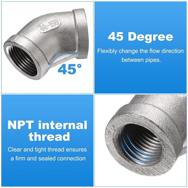 - Feature - The 45° angle can change the flow direction between pipes to meet the requirements of pipe layout and installation. Elbow casting fittings are used to connect NPT female threaded pipes, and can be adapted to threaded stainless steel pipe fittings.