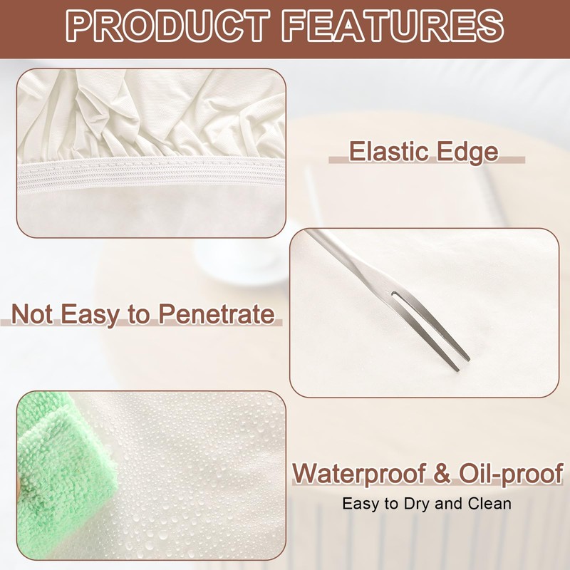 - Features: Our round elastic tablecloth is beautiful and practical, with a high waterproof, oil-proof and stain-resistant surface. The elastic edge makes the PVC tablecloth fit tightly and will not move or fall off, which is convenient for you to use in catering activities