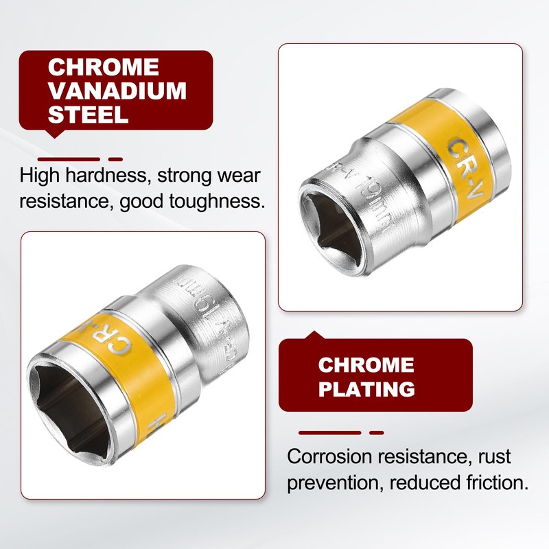 - Size - Square head: 1/2"; Metric hexagon socket: 19mm; Total length: 38mm/1.5". Package includes: 4 x 6-points sockets. Clear specifications are marked on the surface of the socket, which can quickly identify the application and improve work efficiency.