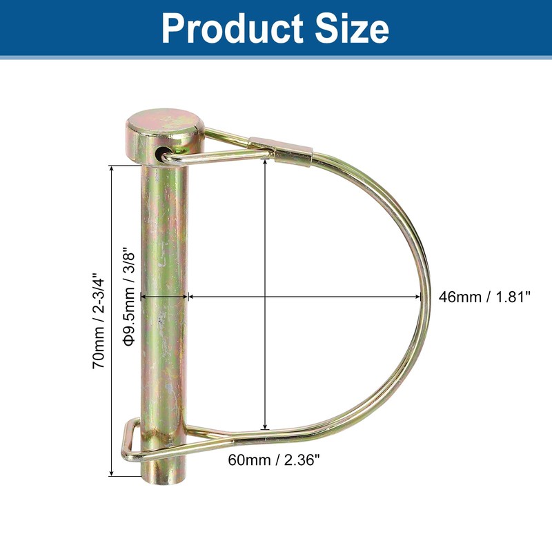 - [Size] Pins Dia: 9.5mm(3/8"); Pins Length: 70mm(2-3/4"); Coil Inner Length: 46mm / 1.81"; Coil Inner Width: 60mm / 2.36"; Ring Thickness: 2mm/0.08"; Package includes: 4Pcs x Linch Pin with Ring