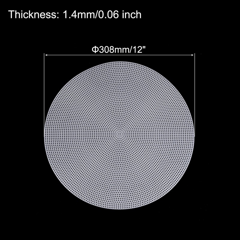 - Package Content: 4pcs x Plastic Canvas Mesh Sheet; Diameter: 308mm/12 inch; Thickness: 1.4mm/0.06 inch; Hole Dia: 2.4mm/0.09 inch