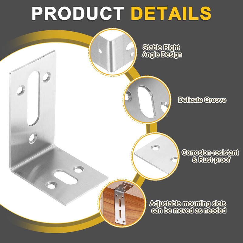 [Material] - These L-shaped corner brackets are made of stainless steel, which is durable, corrosion-resistant, rust-proof, stable and not easy to break. They are made of exquisite craftsmanship, moisture-proof and rust-proof, and will not damage the surface of your home. They can be used for a longer time.