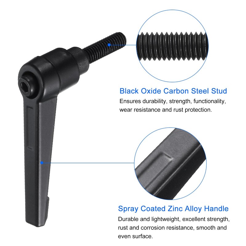 Black oxide carbon steel threaded male stud ensures durability, strength, functionality, wear resistance and rust protection. Durable and lightweight zinc alloy lever handles provides excellent strength and corrosion resistance. The spray coated lever has a smooth, even surface that protects the handle from rust and corrosion.