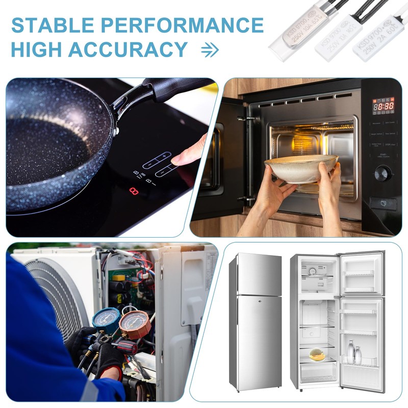 - This is a KSD9700 Normally Closed (NC) Temperature Control Switch, designed for precise thermal protection and regulation in electrical appliances and equipment. It automatically opens the circuit when temperature rises beyond the set point and closes it once cooling occurs, ensuring safe operation. Great for motors, washing machines, air conditioners, fans, induction cookers, and other small household or industrial devices requiring reliable temperature management.