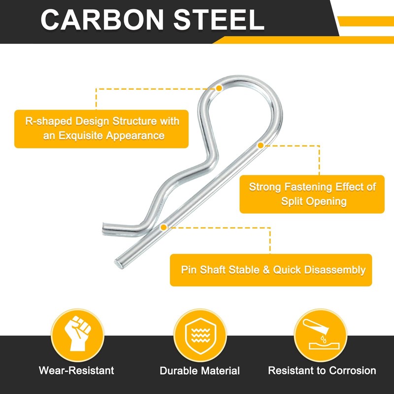 • [EASY INSTALLATION]: These R-pins are easy to use, simply insert the R-pin into the hole of the pre-placed U-pin until the pin head rests against the bolt, then use pliers to spread the R-pin's fork legs in opposite directions quickly and securely secure the bolt and pin.