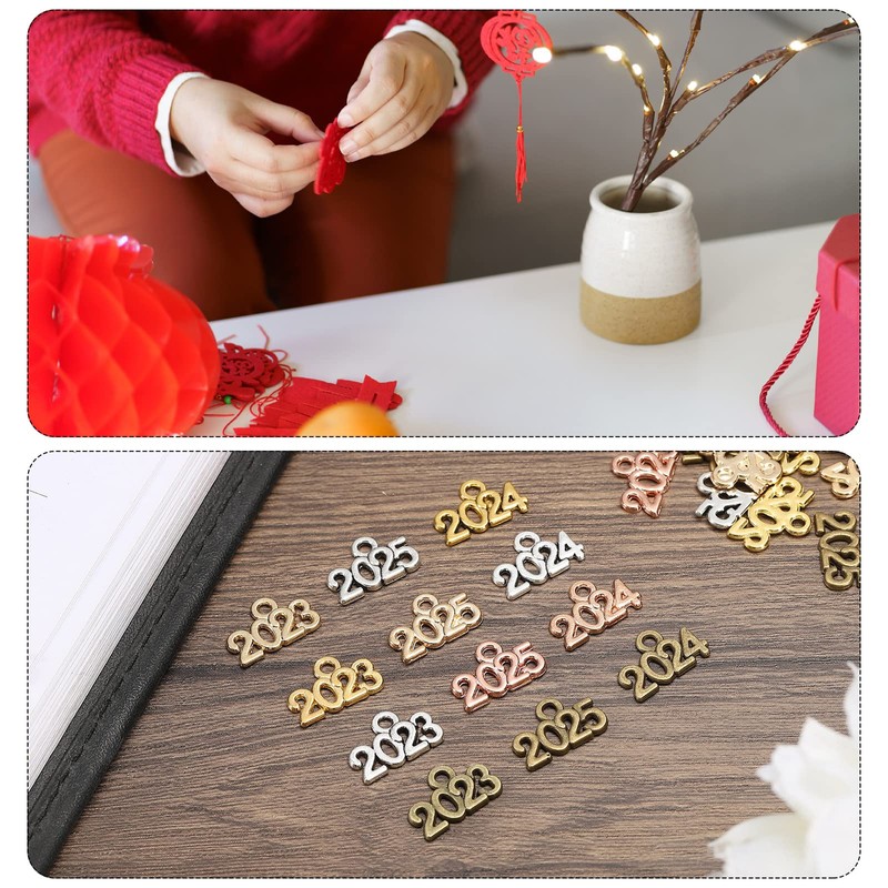 - Package Content: 50pcs x Year 2024 Charm; Length: 14 mm (0.55 inch); Width: 9 mm (0.35 inch); Material: Alloy