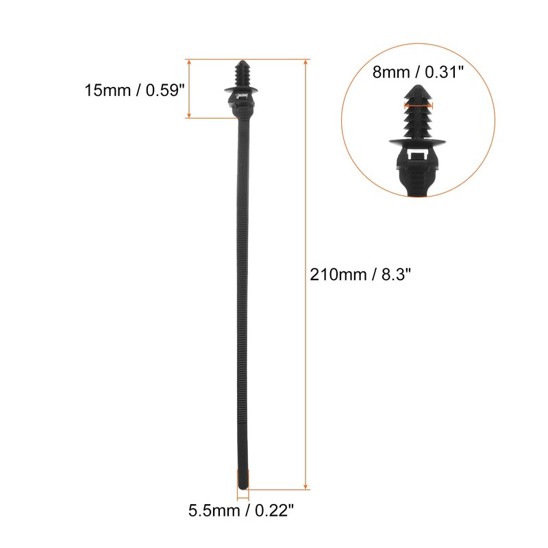 - Size - Cable ties length & width: 8.3 x 0.22 inch / 210 x 5.5mm; thickness: 0.05 inch / 1.3 mm; head length: 0.59 inch / 15 mm; head diameter: 0.31 inch / 7.8 mm; load capacity: 52.86 lb / 24 kg. Package includes 50pcs black push mount cable zip ties.