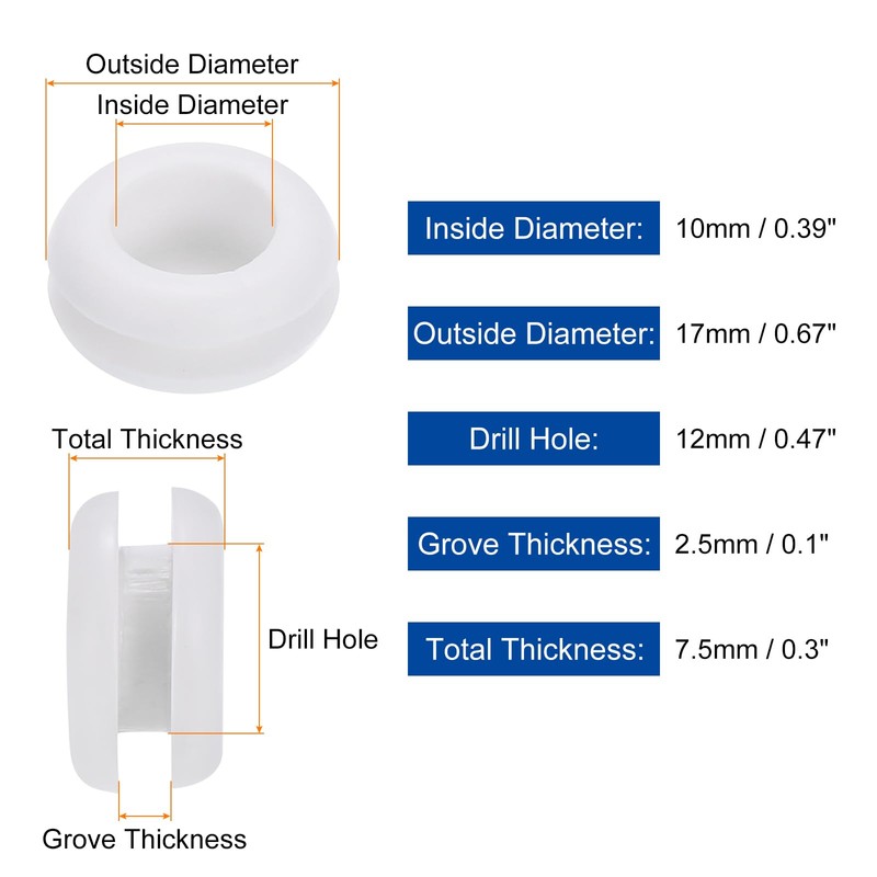 - Rubber Grommets - You will get 50Pcs Round Hole Plugs,Inner Dia.: 10mm/0.39-inch, Outer Dia.: 17mm/0.67-inch, Drill Hole: 12mm/0.47-inch, Height: 7.5mm/0.3-inch, Groove Width: 2.5mm/0.1-inch.Please choose the appropriate rubber grommet according to the drill hole before purchasing.