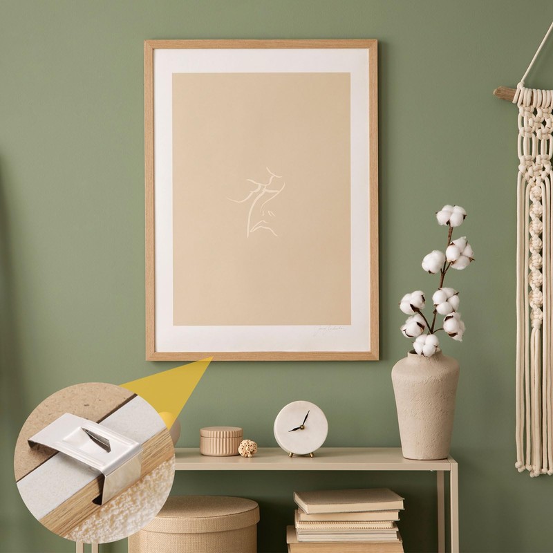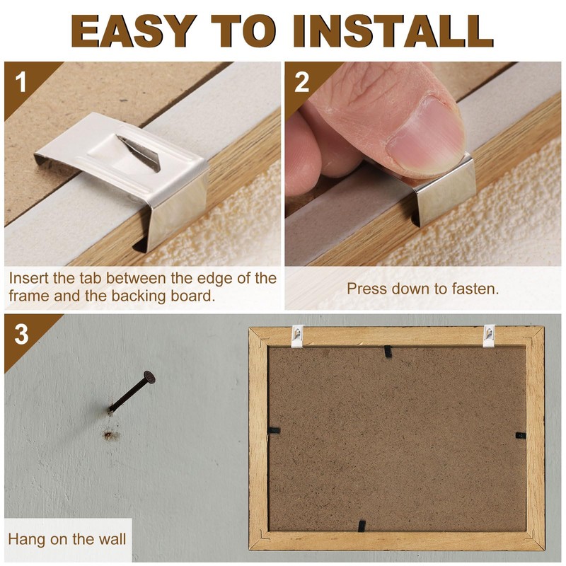- [EASY TO INSTALL]: Hanging the metal spring turn clip is simple and fits most picture frames. You can insert the tab between the edge of the frame and the backing board and press down to fasten, this design makes the installation and removal process easier and faster