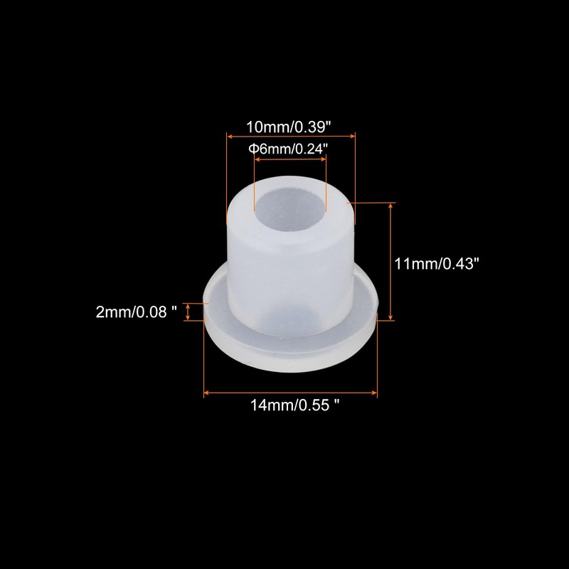 - Mounting Hole Dia: 10mm/0.39-inch;Bore Inner Dia: 6mm/0.24-inch;Height: 11mm/0.43-inch;Head Dia & Head Thickness: 14mm/0.55 inch & 2mm/0.08 inch;Type: Straight Bore;Material: Silicone Rubber;In the package of: 50 x Rubber Grommet