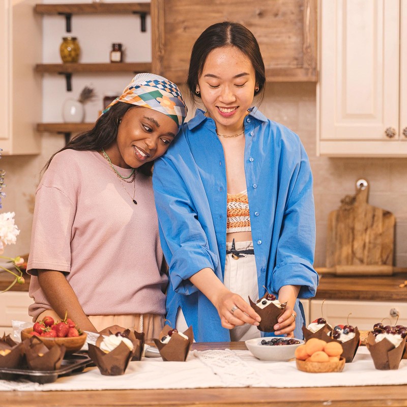 - Material - Tulip-style cups are made from greaseproof paper. They are heat resistant, ensuring they can withstand high temperatures without losing shape or color. The surface is grease-resistant and the paper cups are folded together to make them easy to separate from the cake.