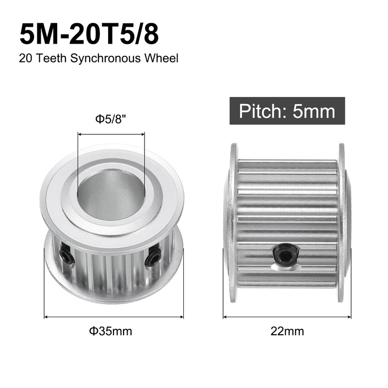 - Size: 20 teeth synchronous wheel 5/8" bore, outer diameter 35mm, thickness 22mm, fit for 15mm width synchronous belt.