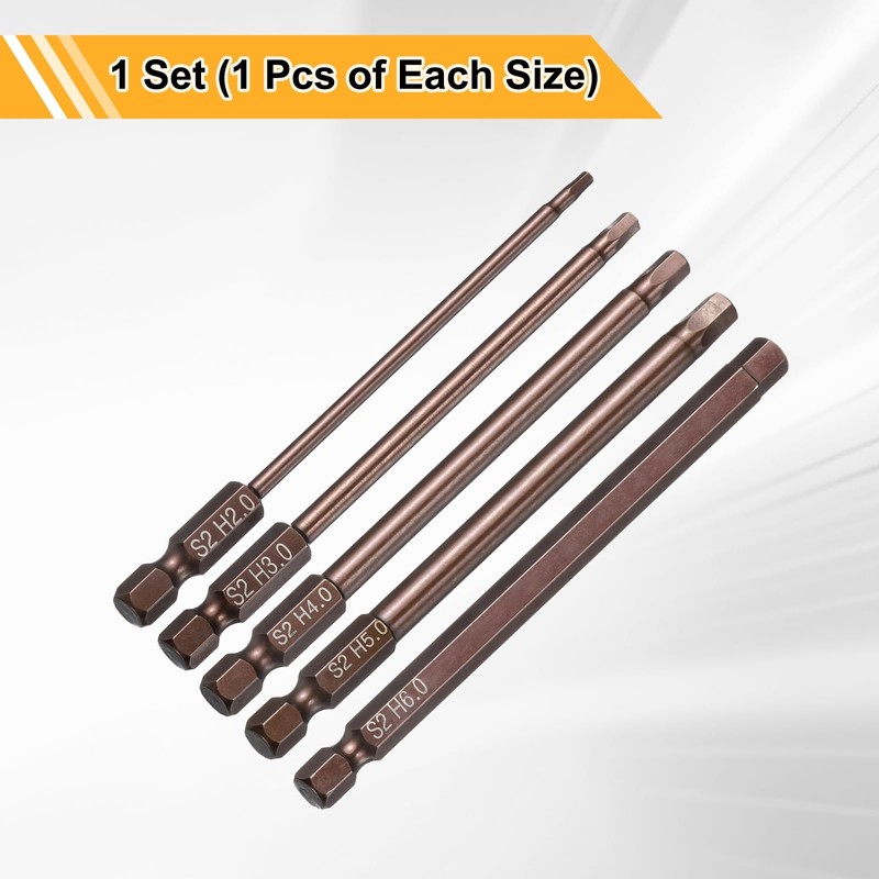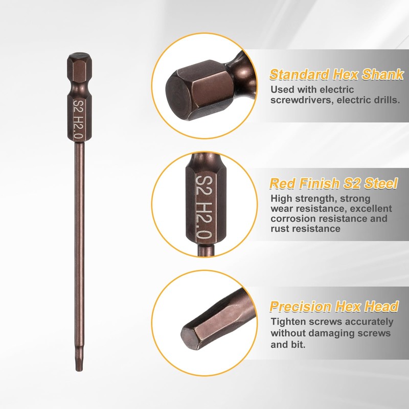 - Size - Metric flat hex head size: H2.0, H3.0, H4.0, H5.0, H6.0, hex shank size: 1/4", total length: 100mm / 4", hardness: HRC58-60 (The recognized stable hardness is around HRC60.). Each hex screwdriver bit is clearly engraved with size number for easy identification.