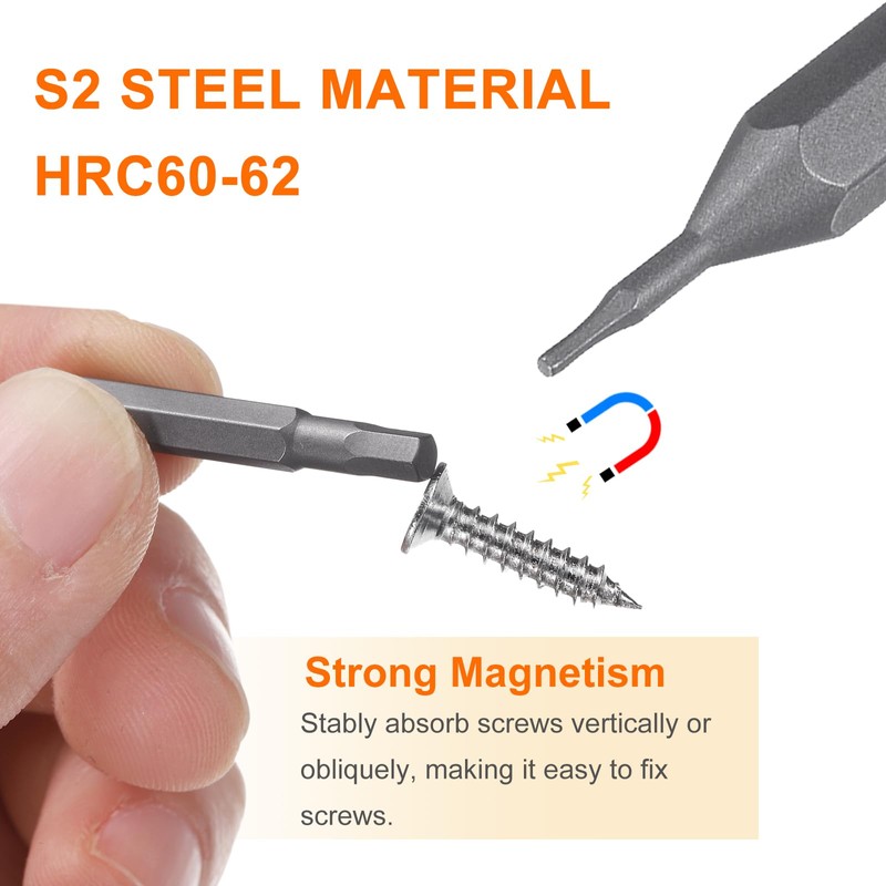 - Material - The screwdriver bits are made of specially heat-treated S2 steel with high strength and hardness (HRC58-62), durable and anti-bending, and the surface is sandblasting for enhanced grip and corrosion resistance