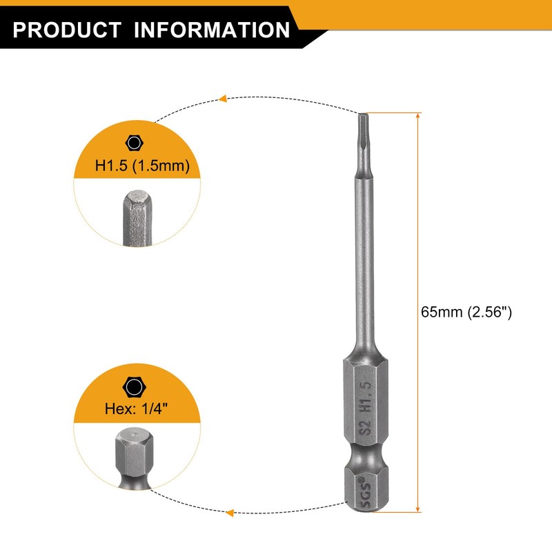 - Size - Metric flat hex head size: H1.5 (1.5mm); hex shank size: 1/4"; overall length: 65mm (2.56"); hardness: HRC59-61 (The recognized stable hardness is around HRC60.). The H value indicates the size of the hexagonal head. The larger the value, the larger the head, and the smaller the value, the smaller the head.