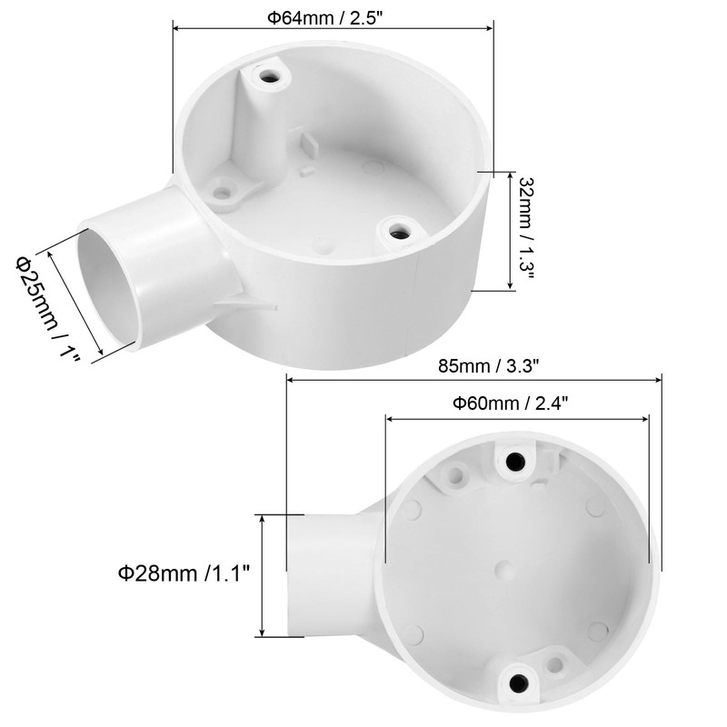 • The conduit box, we provide here, is in the size of: Total Size: 85 x 64 x 32mm / 3.3 x 2.5 x 1.3 inch (L*W*H); Main Body Size: 64 x 60mm / 2.5 x 2.4 inch (OD*ID);Interface Size: 28 x 25mm / 1.1 x 1 inch (OD*ID);In the package of: 5Pcs x Junction Box with Cover, Screws.