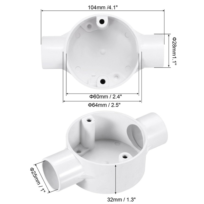 - The conduit box, we provide here, is in the size of: Total Size: 104 x 64 x 32mm / 4.1 x 2.5 x 1.3 inch (L*W*H); Main Body Size: 64 x 61mm / 2.5 x 2.4 inch (OD*ID);Interface Size: 23 x 20mm / 0.9 x 0.8 inch (OD*ID);In the package of: 5Pcs x Junction Box with Cover, Screws.