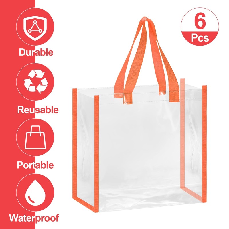 sourcing map 6 Pack Clear Tote Bags Bulk, 12" x 6" x 12" Reusable Clear Plastic Tote Bags with Handles PVC Stadium Approved Clear Bags Beach Bag Transparent for Work Stadium Events, Orange