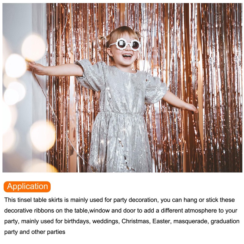 This tinsel table skirts is mainly used for party decoration, you can hang or stick these decorative ribbons on the table,window and door to add a different atmosphere to your party, mainly used for birthdays, weddings, Christmas, Easter, masquerade, graduation party and other parties