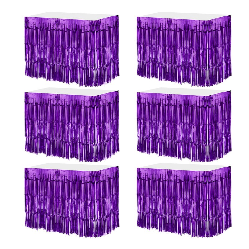 - Color: Dark Purple; Material: Plastic; Total Size: 75*275cm/29 x 108 Inch (W*L); In the package of: 6 Pcs x Foil Fringe Tinsel Table Skirts